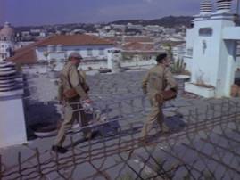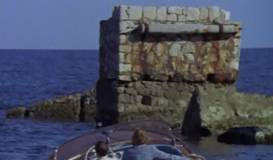 Raoul swims to shore from Sabot’s yacht, and hands the stolen gold to the waiting Carlo and Nico. |