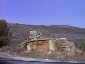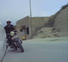 The policeman follows Carlo and Nico around a road by a working quarry. |