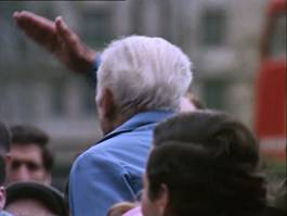 Demonstration at the arrest of Pedro. Red bus emerging from right suggests London. That could only mean Hyde Park, couldn’t it? Speakers’ Corner? |