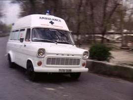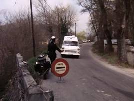 Ambulance crosses a bridge and follows the road along the river before being stopped at a police road-block. |