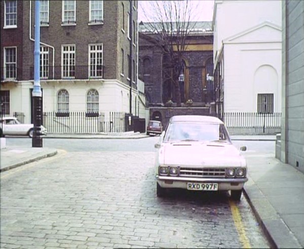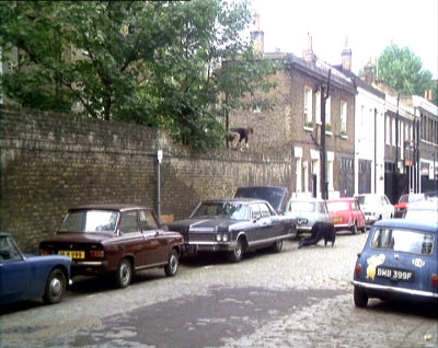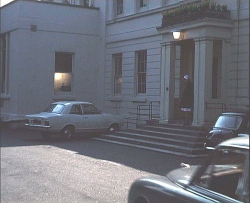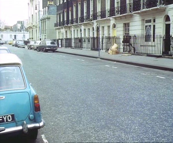 Wilton Mews looking onto Wilton Street, SW1 - Elizabeth Saxon, Jeff's lawyer follows Kevin O'Malley in her car and sees him park up near the Club 70. She parks her Triumph opposite and watches where him get out of the car.
