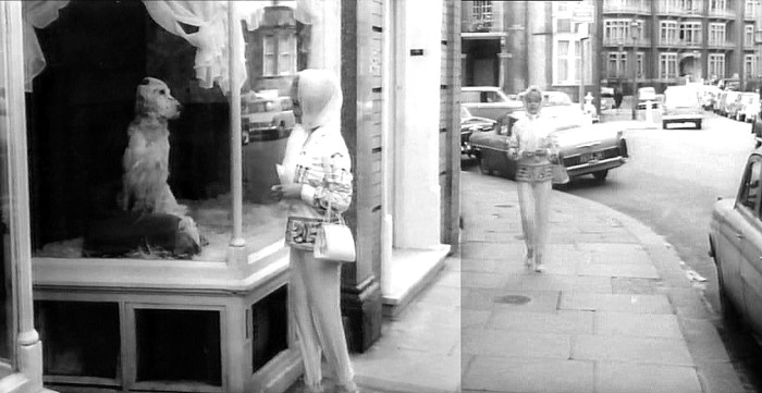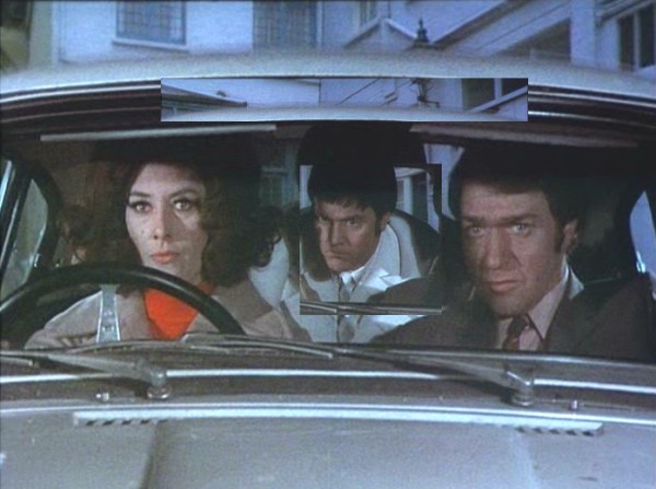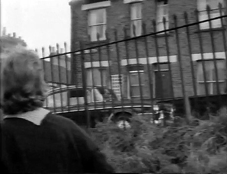 Petersham Place, SW7 - Elizabeth Saxon sets off in her Triumph with Kevin O'Malley and Marty aboard to chase after Anne-Marie Benson and Angela Kendon who have stolen O'Malley's car from the Club 70 (back projection of footage from But What A Sweet Little Room).