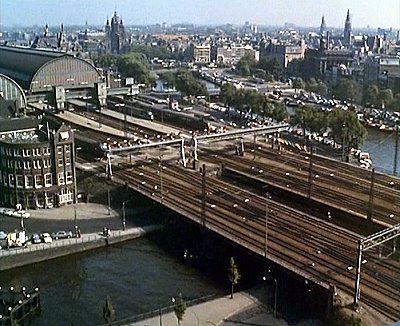 Centraal Station, Stationsplein, Amsterdam - Establishing shot of Amsterdam as Simon and Tom, and Mable Upwater return to their hotel after a night on the town. Simon Templar and Mable Upwater go out for a meal the night he is to steal the diamond.