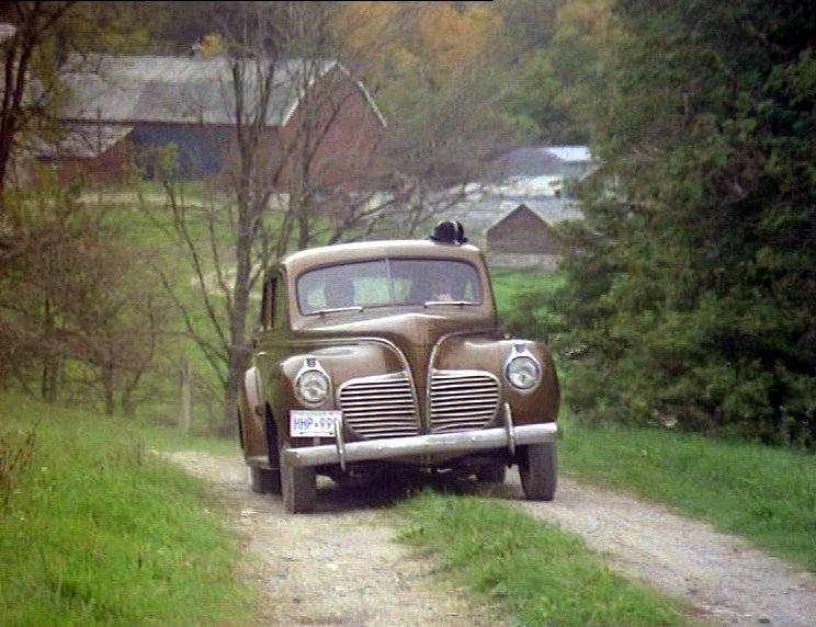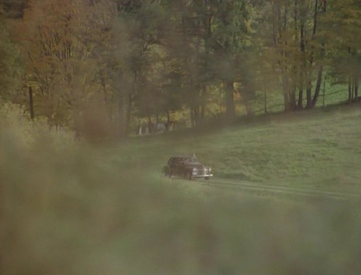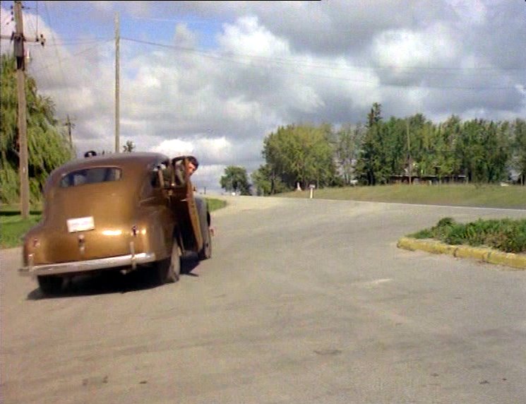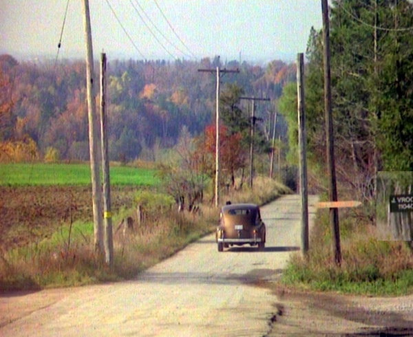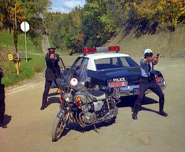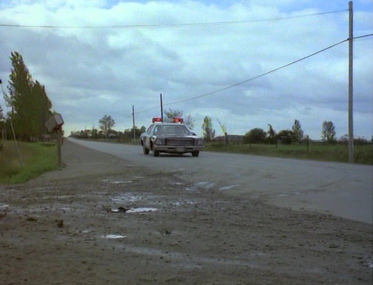 Cop car driving down road, over culvert, and past Emily
