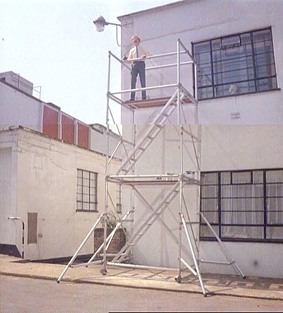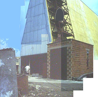 Area around water tank (tall triangular structure is water tank back drop, the staircase is a moveable platform for painting scenes) Scene Dock (F), and back of standing sets.