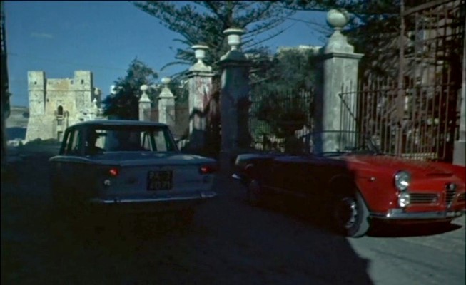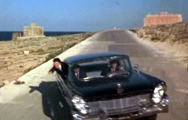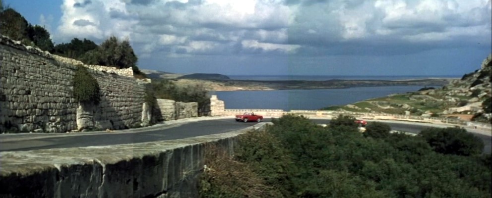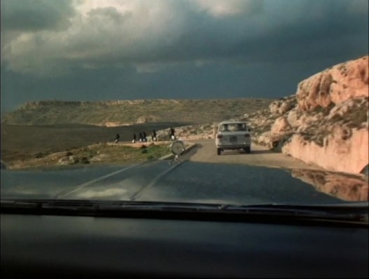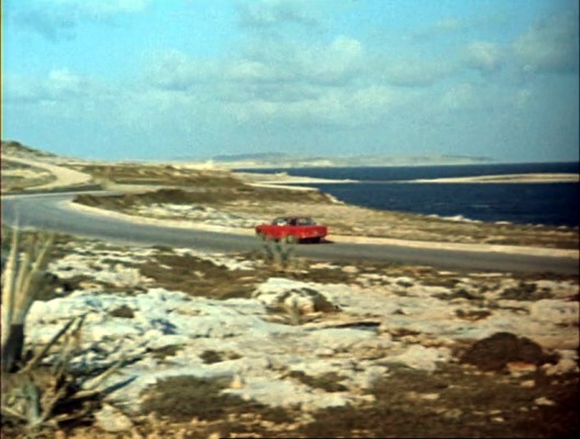 Harry (Robert Vaughn) races down from Mdina in the beach buggy, to the