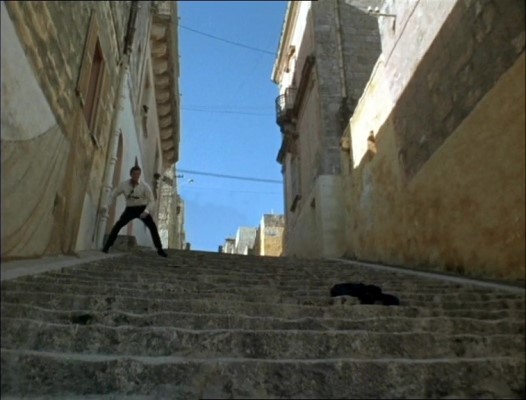 when Allessadro's men arrive he hides on a steep stairway (Triq San Publiju). After